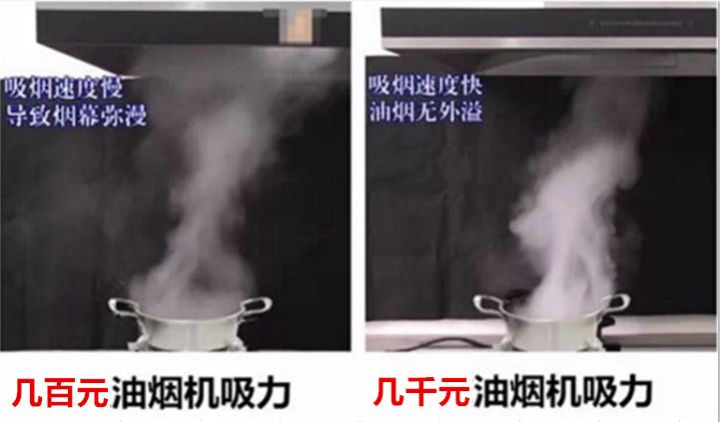 第一方面差的是“吸煙效果”,劣質(zhì)吸油煙吸煙速度慢,常常導(dǎo)致廚房中煙霧彌漫,無法把油煙吸干凈;而優(yōu)質(zhì)吸油煙機吸煙速度快,并且油煙無外溢油煙吸凈率較高,如上圖所示同樣的負壓區(qū),吸力及吸煙效果差異很大。