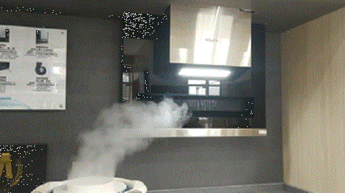 我們同時(shí)開(kāi)啟幾個(gè)水霧鍋,模仿家里爆炒時(shí)產(chǎn)生大量油煙,制造“煙霧彌漫”的效果,然后開(kāi)啟油煙機的快速檔。